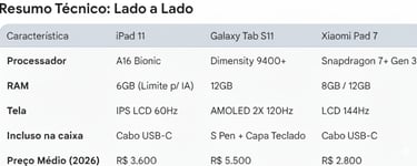 Qual tablet escolher em 2026? Analiso o iPad 11 e a polêmica da RAM, o kit completo do Galaxy Tab S11 e a potência do Xiaomi Pad 7. Preços, telas e especificações detalhadas.