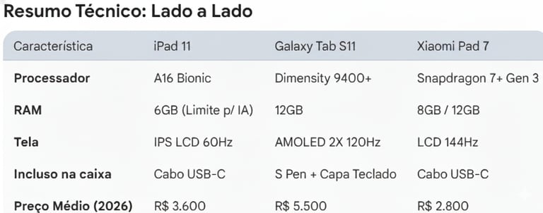 Se você quer economizar e não liga para o "status" da marca, o Xiaomi Pad 7 é um monstro. Se você precisa de uma ferramenta completa de trabalho com caneta e teclado sem custos extras, o Galaxy Tab S11 se paga pela conveniência e pela tela maravilhosa. Já o iPad 11 só vale a pena se você estiver preso ao ecossistema da Apple, mas fique ciente de que os 6GB de RAM podem envelhecer mal com as novas IAs.