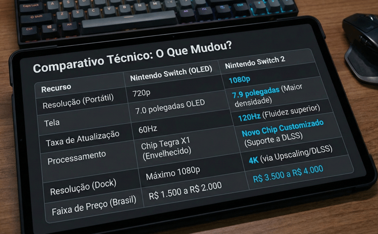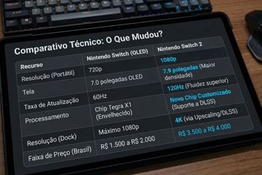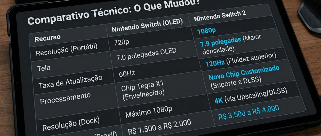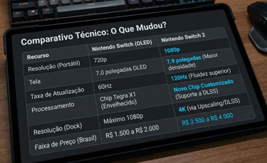 Para quem gosta de números, a diferença é brutal. O Switch 1 já mostrava sinais de cansaço nos últimos anos, e o Switch 2 chega para corrigir exatamente os pontos fracos de performance.