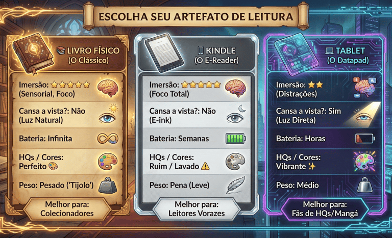 Kindle vs. Livro Físico vs. Tablet: O Guia Definitivo para Leitores de Sci-Fi e Fantasia